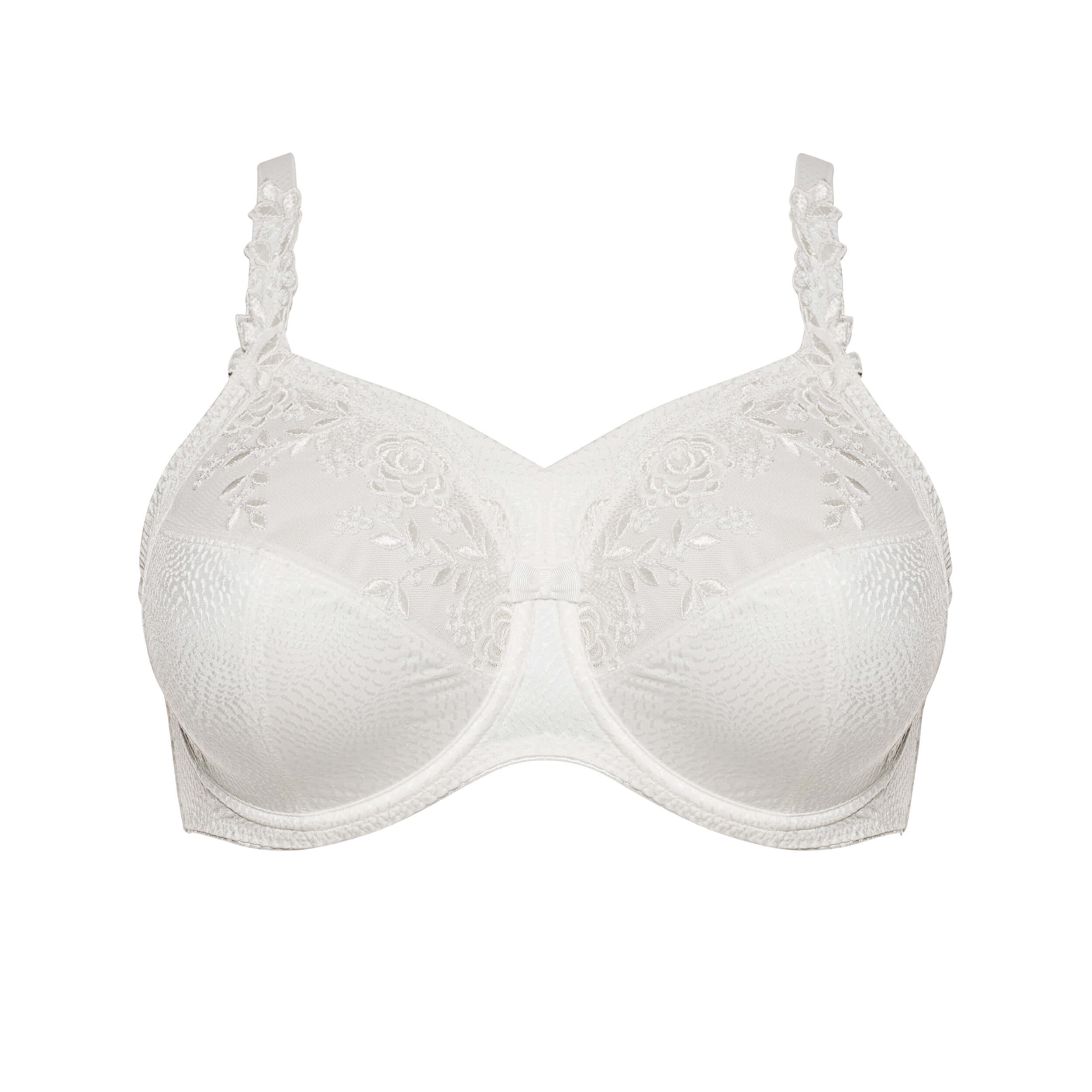 Konstrukcja biustonosza opiera się na profilowanych miseczkach z fiszbinami, które skutecznie zbierają i unoszą piersi, nadając im naturalny, harmonijny kształt. Dolna część miseczek wykonana została z funkcjonalnej, stabilnej mikrofibry, zapewniającej trwałe wsparcie nawet przy całodziennym noszeniu. Górna część miseczek zdobiona jest delikatnym, eleganckim haftem, który subtelnie podkreśla dekolt i nadaje całości kobiecego charakteru.