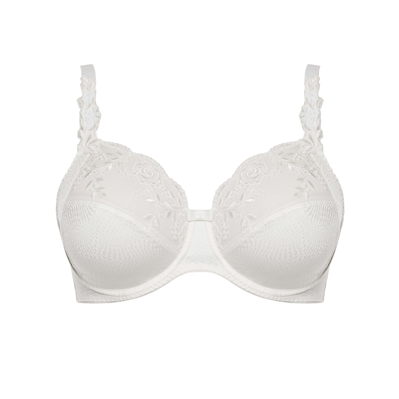 Górna część miseczek została ozdobiona eleganckim haftem na stabilnym tiulu, który dodaje lekkości i subtelnej finezji, nie ograniczając przy tym stabilności. Wysokie boczne panele pomagają centrować biust, poprawiają sylwetkę i zwiększają komfort noszenia przez cały dzień.