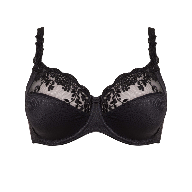 Trójdzielne miseczki wykonane z mocnego, trwałego żakardu skutecznie unoszą i modelują piersi, nadając im naturalny, harmonijny kształt. Górna część miseczek została ozdobiona delikatnym haftowanym motywem na stabilnym tiulu, który dodaje lekkości i podkreśla elegancki charakter biustonosza.