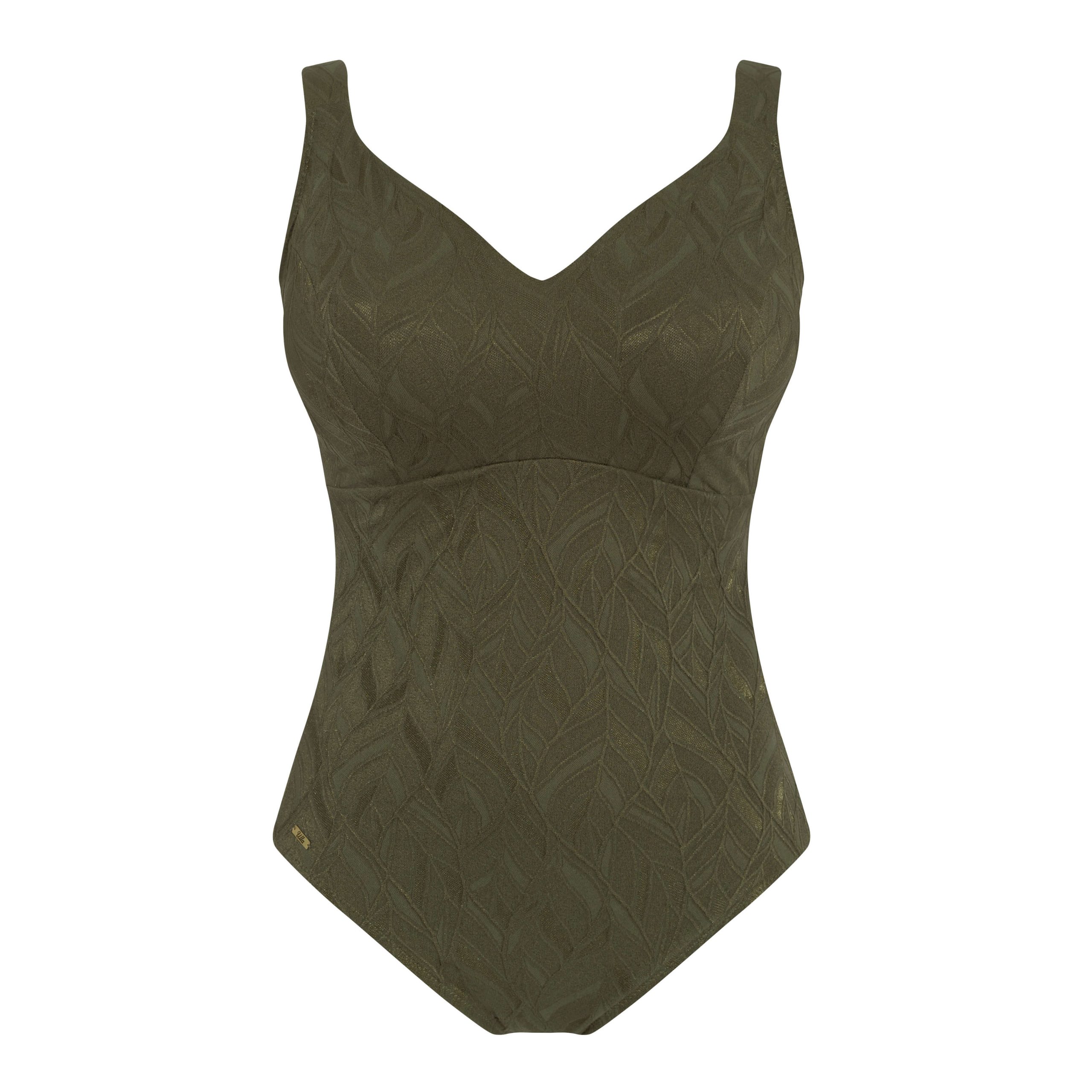 Model Monaco zachwyca szlachetnym, głębokim kolorem oliwkowym oraz delikatną, tłoczoną strukturą materiału inspirowaną motywem liści. Subtelny połysk i elegancki wzór nadają kostiumowi luksusowy charakter, dzięki czemu prezentuje się wyjątkowo stylowo na każdej sylwetce.